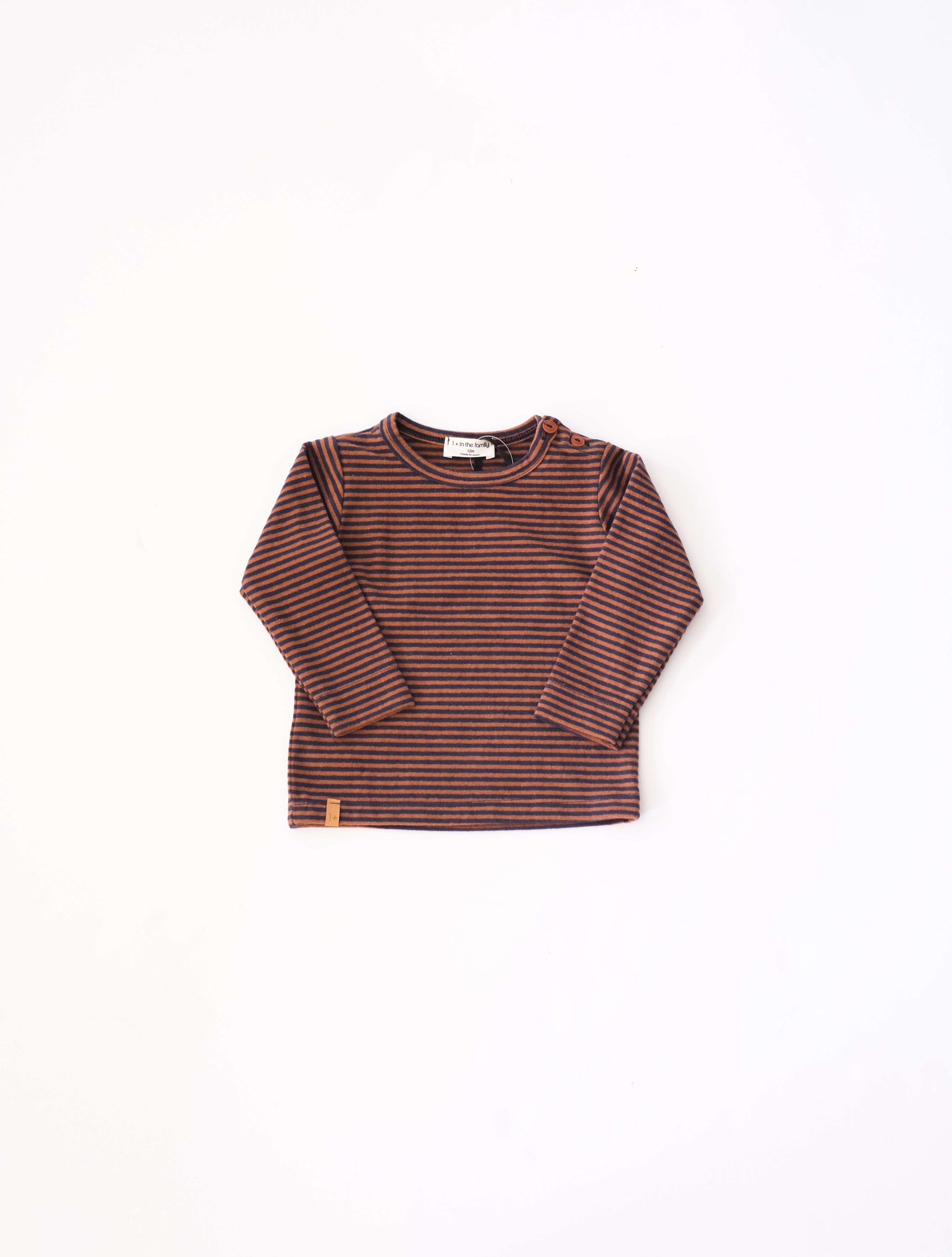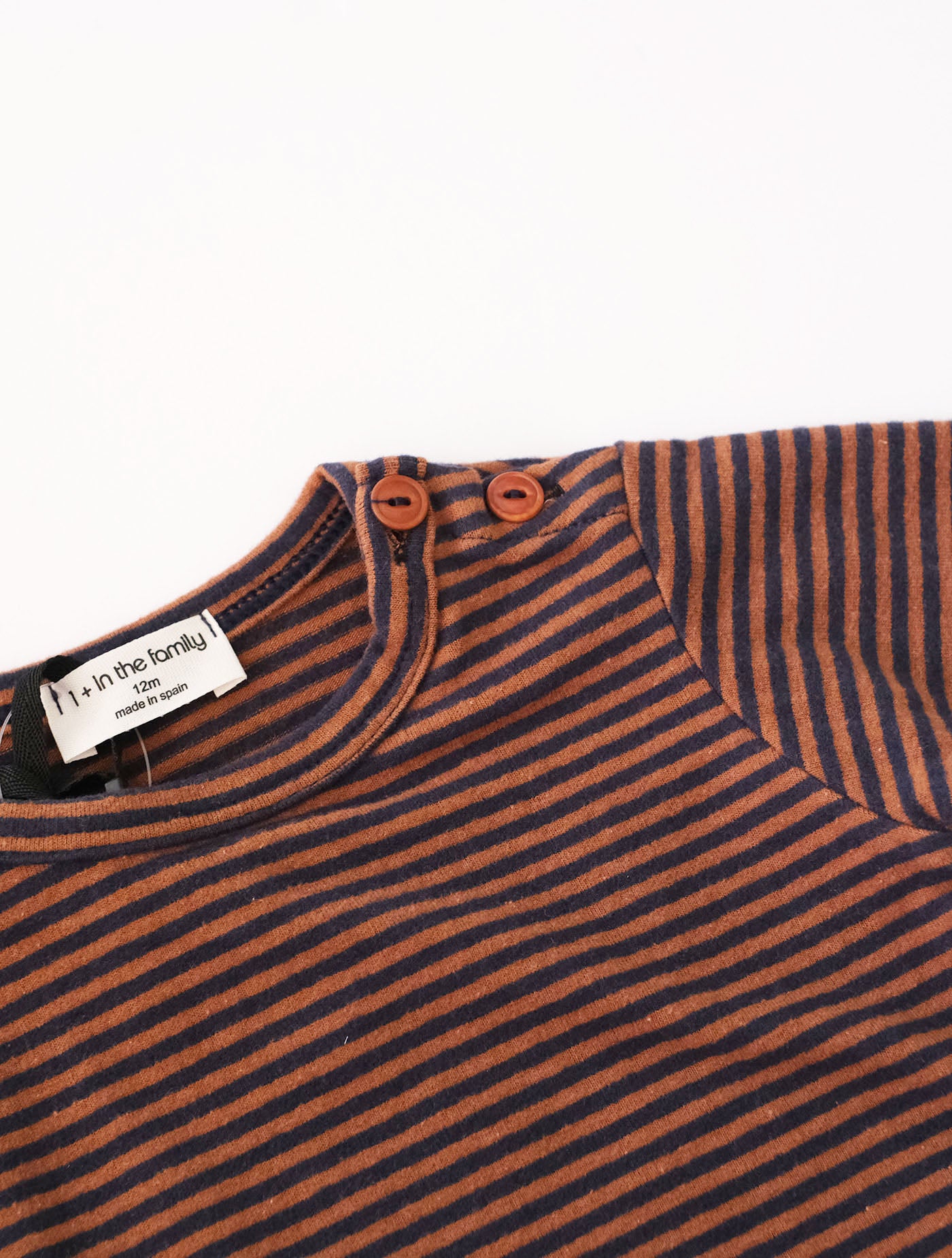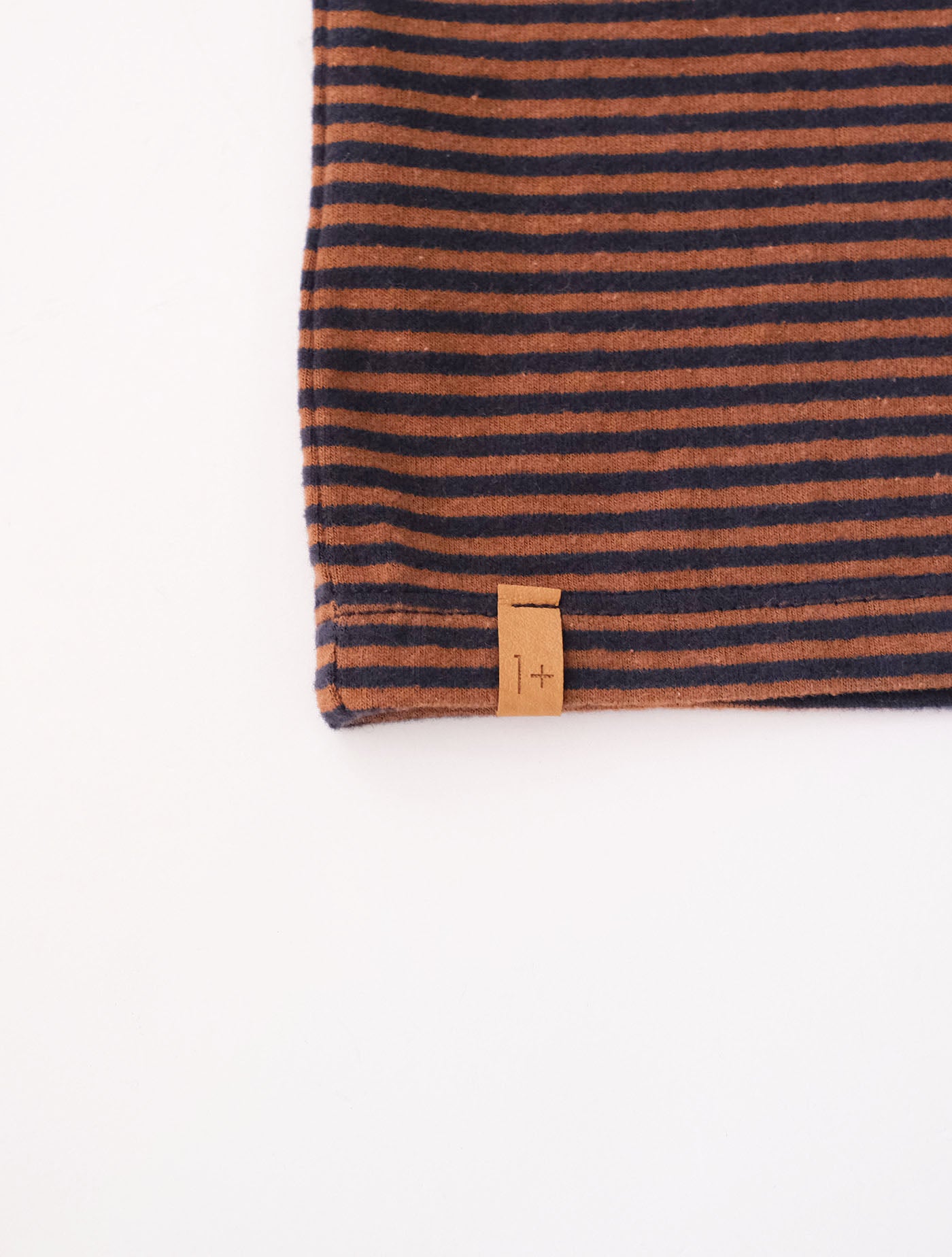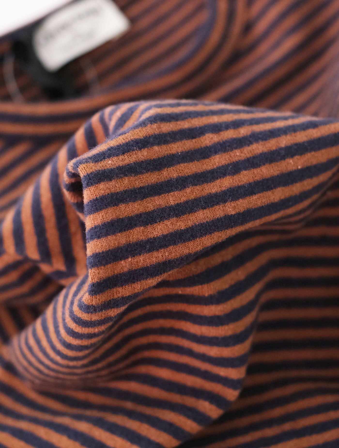 秋冬らしい温かみのあるブラウンとダークブルーのストライプ柄が特徴の長袖トップス。