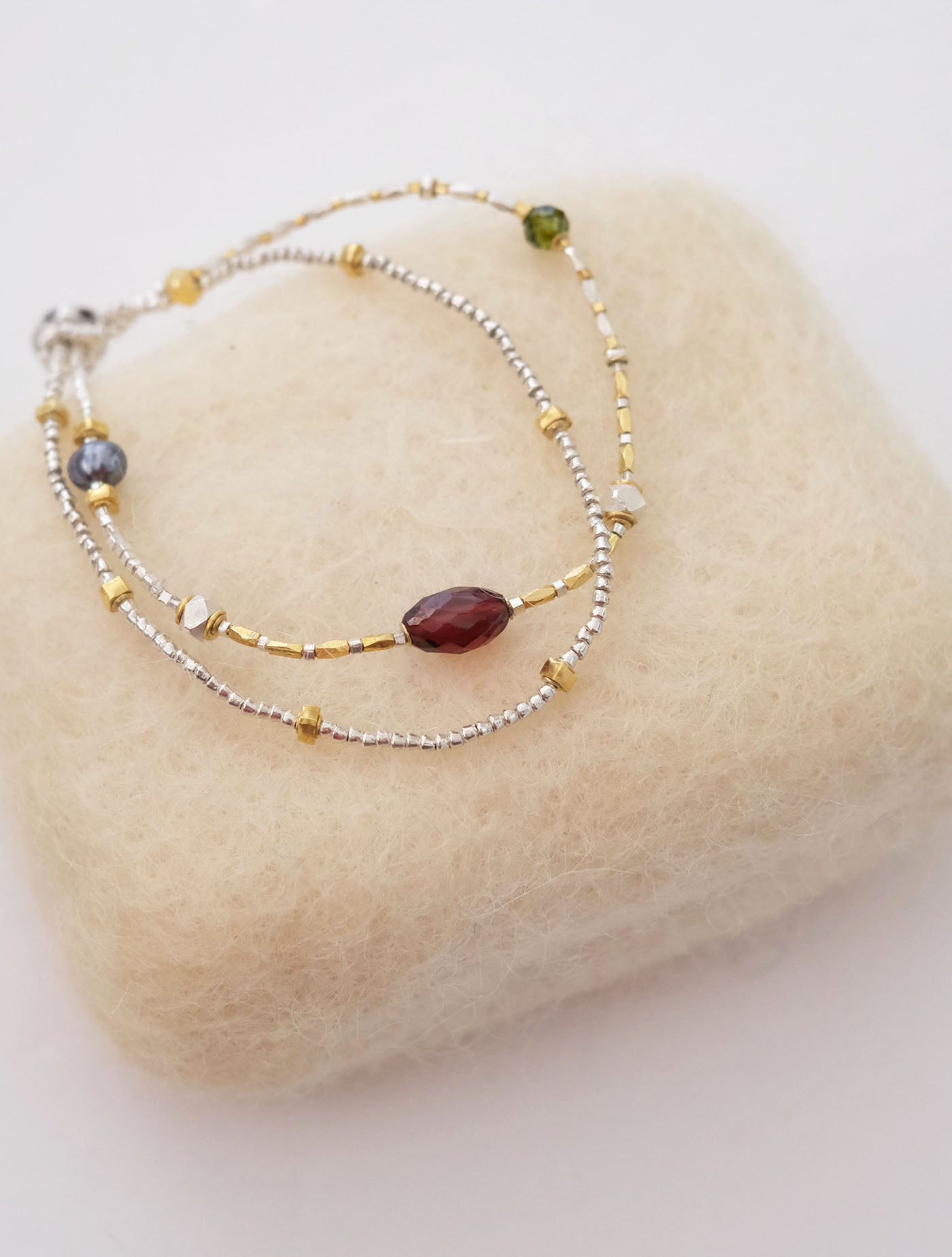 緑色の石はジルコン、赤紫色の石はガーネット、銀黒色には淡水パール(染色)を使用。