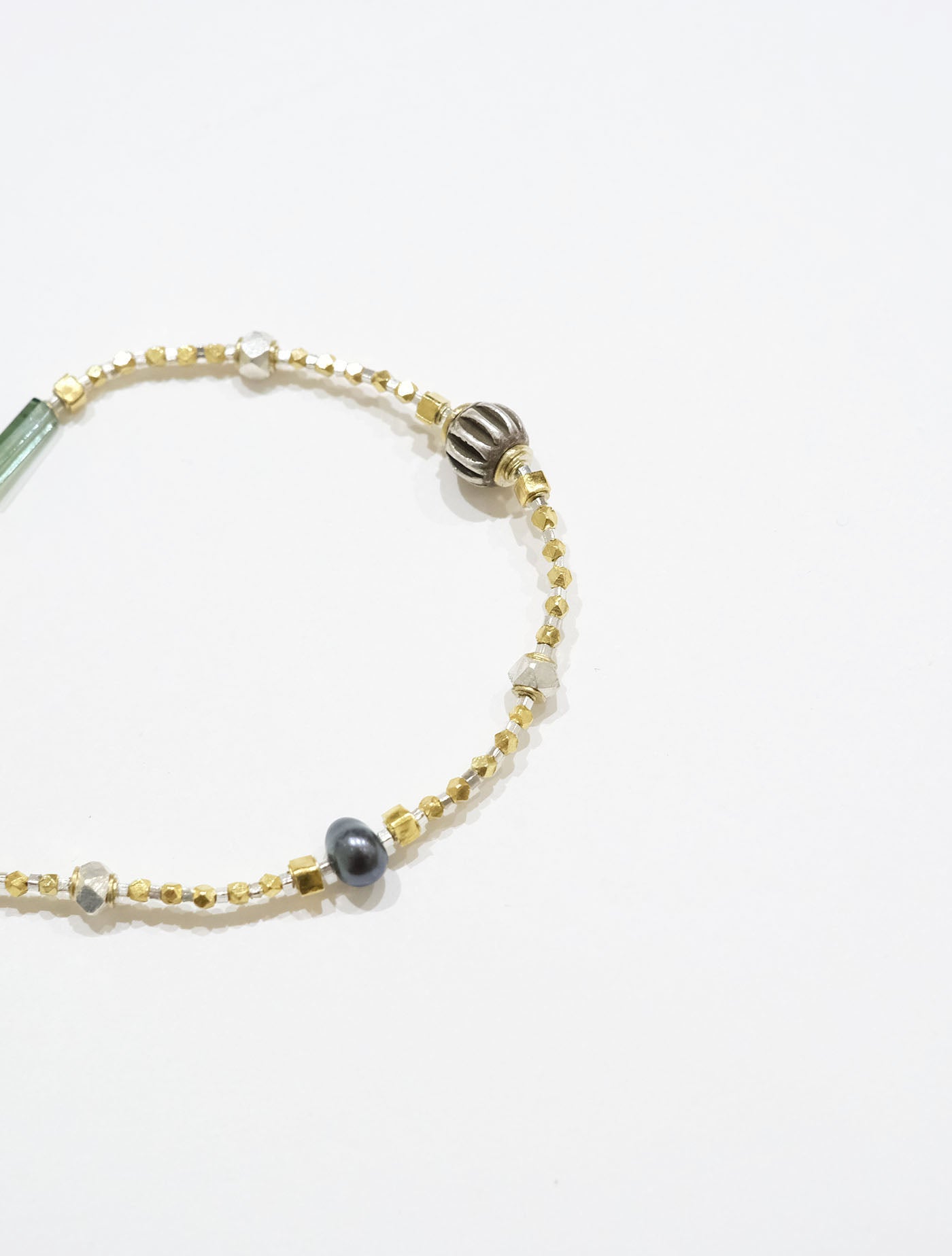 緑色の石はグリーントルマリン、銀黒色は淡水パールを染色したもの。