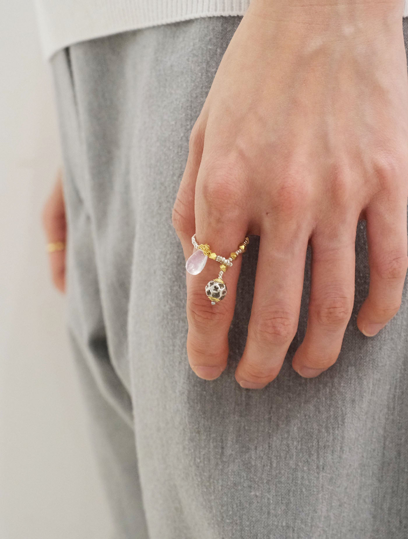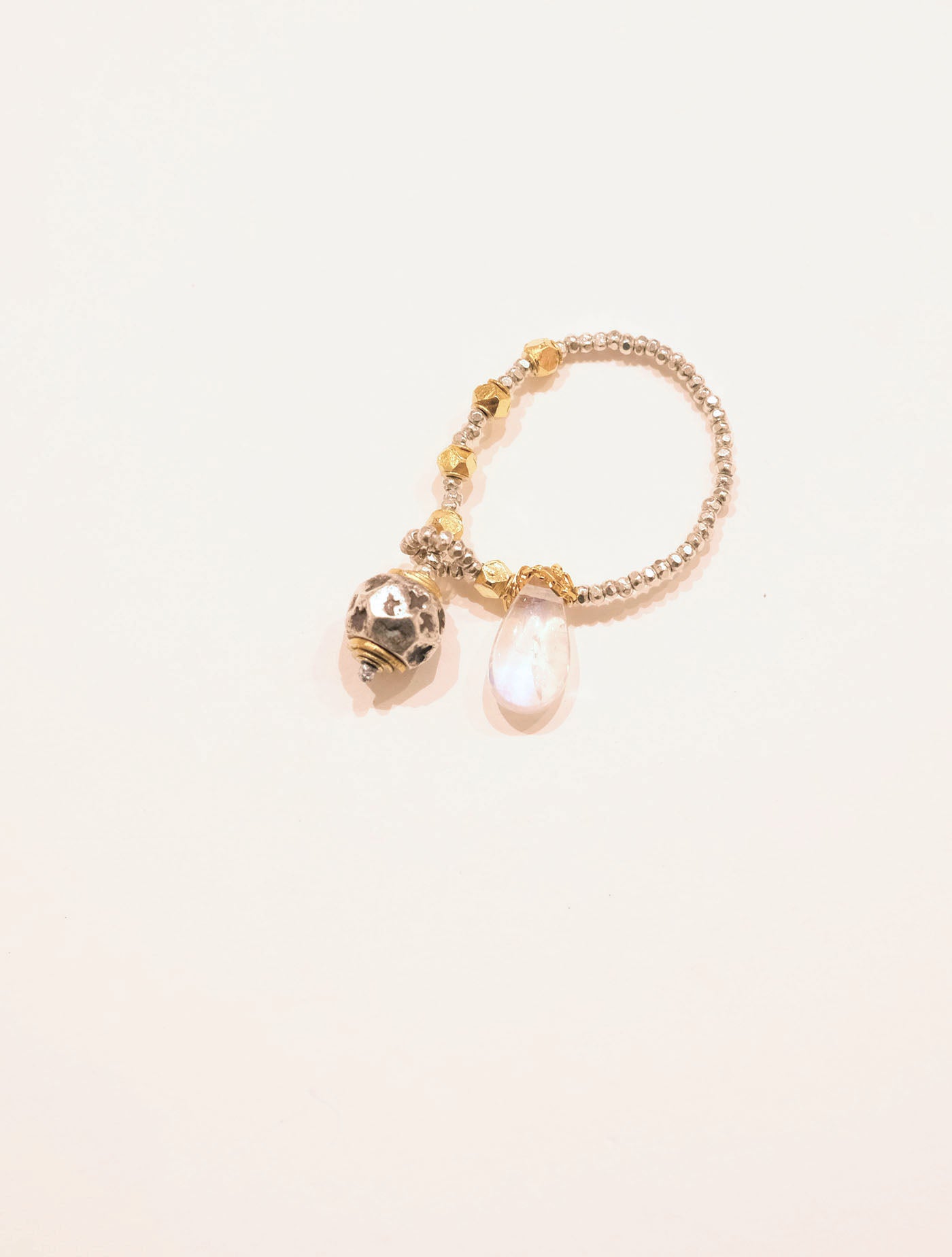 乳白色のレインボームーンストーンとアトラス山脈周辺に住むベルベル人系の部族に作られた多面体型のオールドシルバーを使用したリングです。